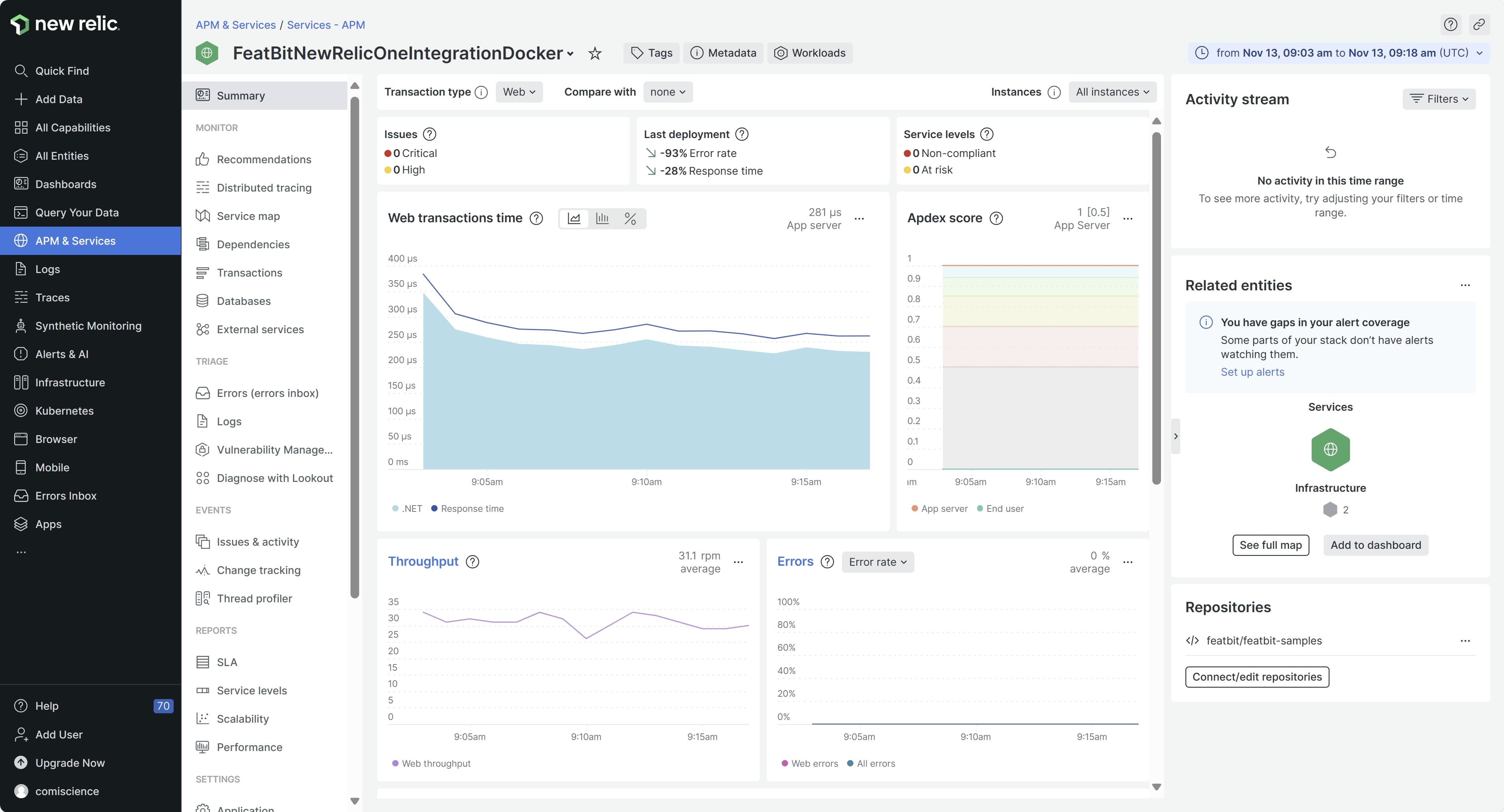 To view FeatBit events in New Relic One, navigate to your application's APM dashboard and select the app you have configured for the New Relic One webhook. You can then track changes via: