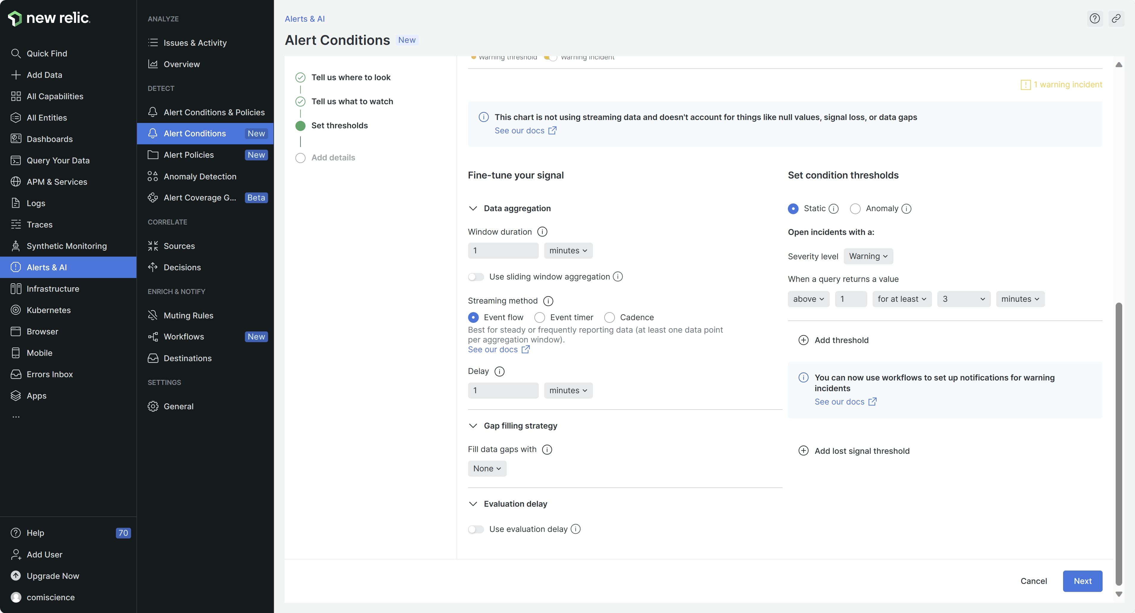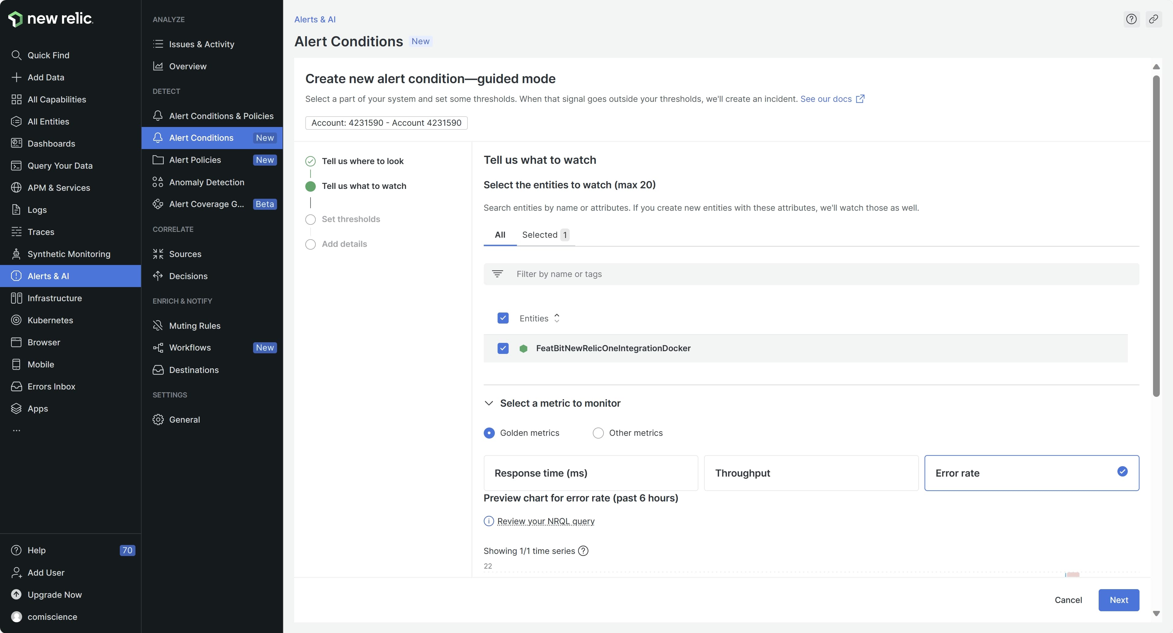 Configure the alert by following New Relic's instructions and selecting your preferred metrics. Specify what should be monitored: