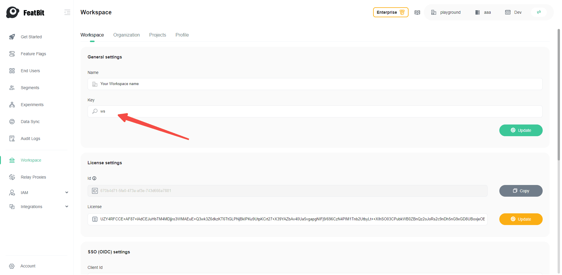 Copy the workspace key in the General settings, you will need it when login with SSO